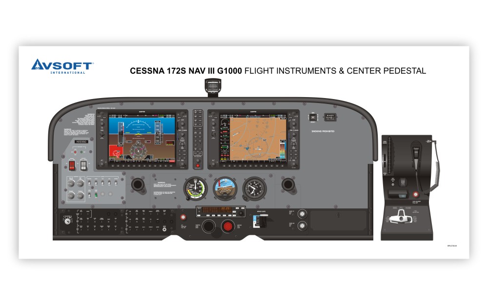 The Cessna 172 Nav III cockpit with Garmin 1000 avionics and is drawn using Garmin and Cessna documentation. The aircraft is not shown in any particular phase of flight or switch positions. Cessna 172 Products