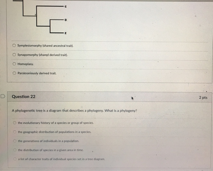 A phylogenetic tree is a diagram that describes a phylogeny. a phylogeny is. True. A phylogenetic tree shows the hypothesized evolutionary relationships among organisms, meaning that its structure can be revised and changed as new information about those relationships becomes known. True. A phylogenetic tree is a diagram that describes a phylogeny. A phylogeny is. the evolutionary history of a species or group of species. A phylogenetic tree is a diagram that describes a phylogeny. A phylogeny is. the evolutionary history of a species or group of species. Refer to the cladogram below. Which shared derived character is common to the lizard and rabbit but not the salmon? Tetrapod locomotion. Convergent evolution describes the independent evolution of traits at different points on a phylogeny, and is not related to nodes. Kingdoms and domains are very broad categories. They can be represented by nodes, but only at a very global level. The figure shows a simplified phylogeny of closely related species of primates. This tree was proposed by comparing DNA sequence changes in the gene for cytochrome oxidase subunit II. The vertical scale represents time and the branch points represent common ancestors. ... A phylogenetic tree is a diagram that describes a phylogeny. A phylogeny is.