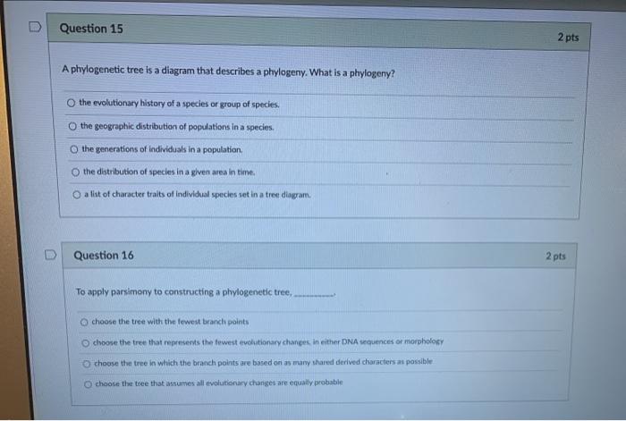 A phylogenetic tree is a diagram that describes a phylogeny. What is a phylogeny? A. The evolutionary history of a species or group of species. B. phylogeny The geographic distribution of populations in a species. C. The generations of individuals in a population. D. The distribution of species in a given area in time. E. A list of character ... Key Difference – Cladogram vs Phylogenetic Tree Evolution and phylogeny are closely related two words which help to describe relationships and characteristics of different organisms. Evolution explains how a particular group of organism has been evolved, developed and selected through the timeline. A phylogenetic tree is a diagram that describes a phylogeny. A phylogeny is... A. the evolutionary history of a species or group of species. If the genus Quercus (oaks) is monophyletic, then this means that all species of oaks... C. are descended from a common ancestor.