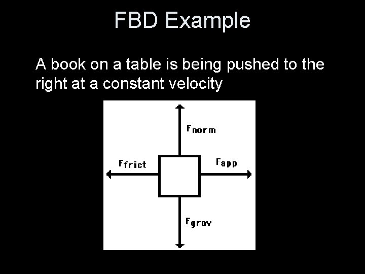 A free-body diagram for this situation looks like this: 6. A rightward force is applied to a book in order to move it across a desk at constant velocity. Consider frictional forces. Neglect air resistance. A free-body diagram for this situation looks like this: motionless by one strap from one shoulder. A free-body diagram for this situation ...