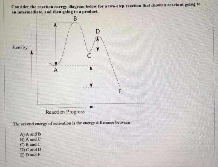 Label the energy diagram for a two-step reaction. Q. A reaction coordinate diagram is shown below for the reaction of A to form E. Answer the following questions.i) Identify the transition state (s)?ii) W... Q. Which reaction coordinate diagram represents a reaction in which the activation energy, Ea, is 50 kj.mol-1 and the ΔHrxn is -15 kj. mol-1?