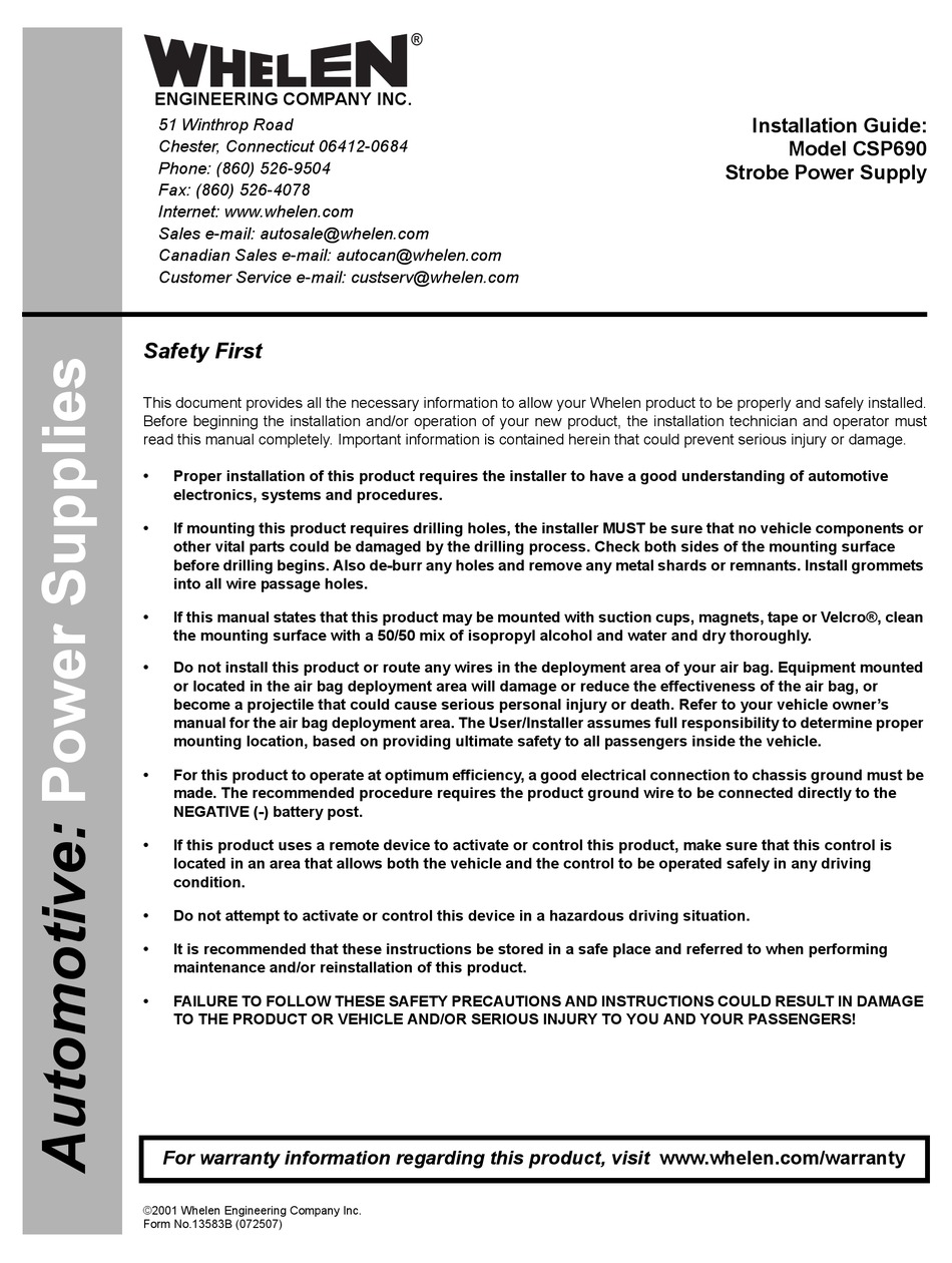 Strobe Power Supplies. ® Wiring: WARNING! The Strobe Light Power Supply is a high voltage device. designations shown in the wiring diagram on page 3. The CSP Strobe Power Supply, like all Whelen components D) When routing the power supply's wires, it is important to choose a WIRING.
