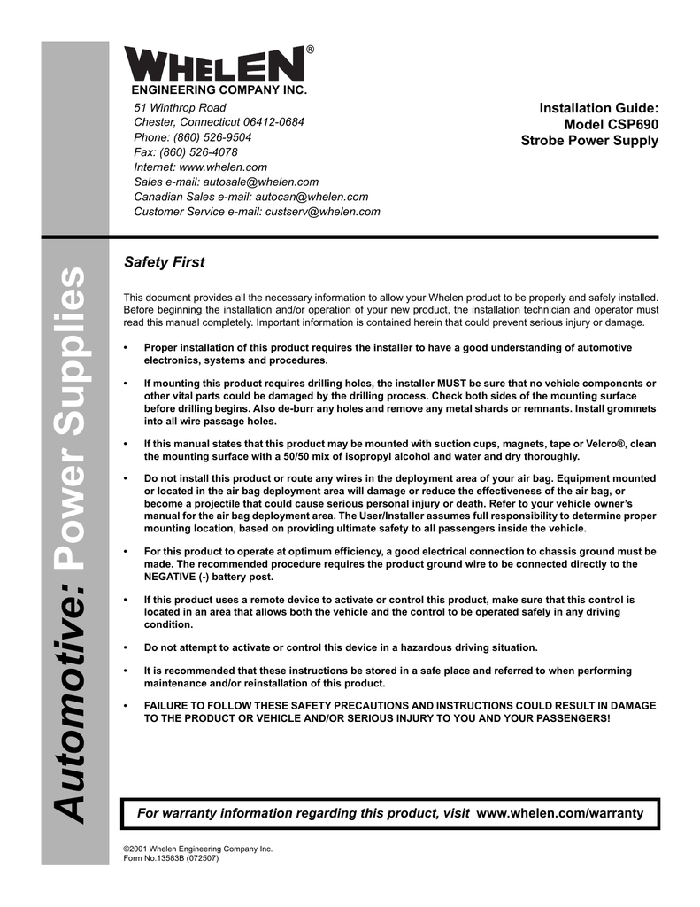 For warranty information regarding this product, visit www.whelen.com/warranty. Automotive: Power Supplies. Wiring Diagram. Strobe Power Supply.1 page