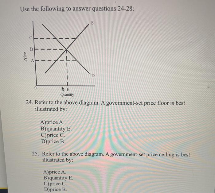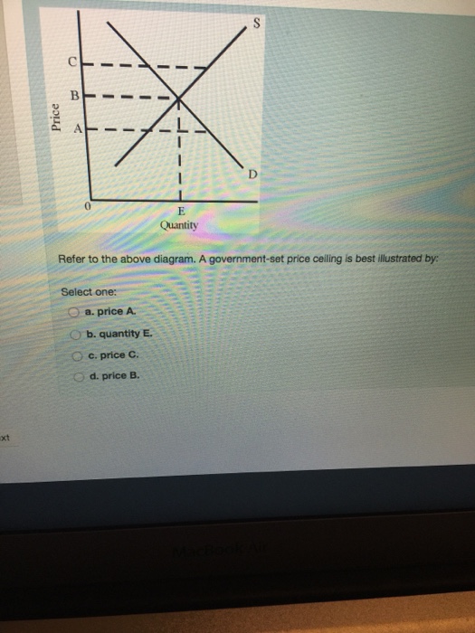 Refer to the above diagram. A government-set price ceiling is best illustrated by: Select one: a. price A. b. quantity E. c. price C. d. price B. Question: Refer to the above diagram. A government-set price ceiling is best illustrated by: Select one: a. price A. b. quantity E. c. price C. d. price B.