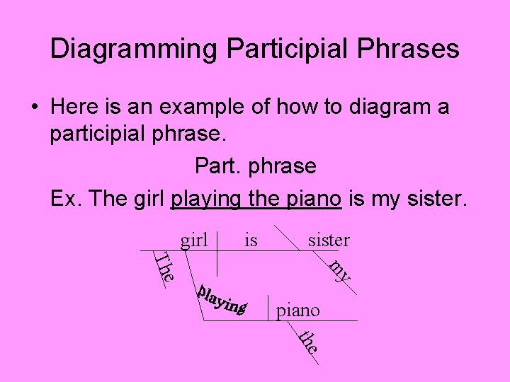 She felt Participle The crumbling bridge must be repaired. Participial phrase. DEFINITION: A participial phrase is a group of words beginning with a Since a participial phrase acts like an adjective, it is attached in the diagram to the noun. How to diagram sentences with participles and participial phrases using the standard diagramming form.