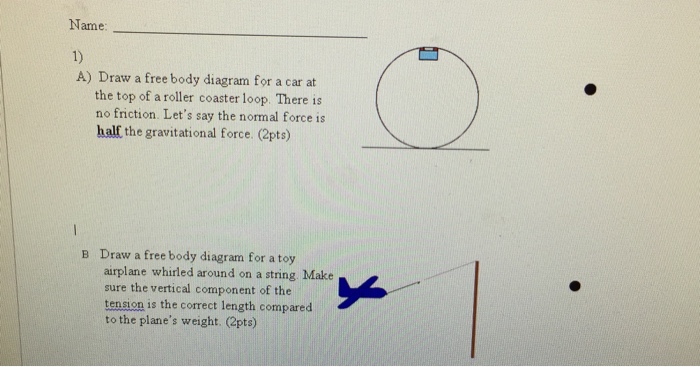 Solved Draw a free body diagram for a car at the top of a | Chegg.com Let's say the normal force is half the gravitational force. Draw a free body diagram for a toy airplane whirled around on a string. Make sure the vertical component of the tension is the correct length compared to the plane's weight.