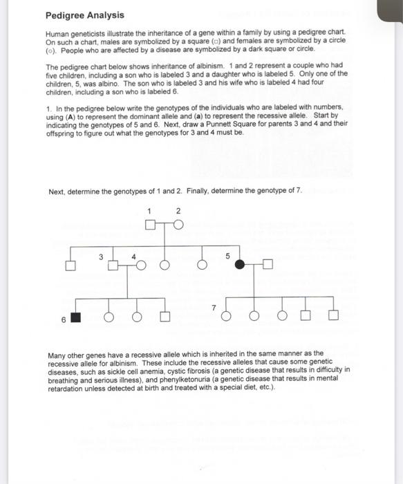 Concise Encyclopedia of Biostatistics for Medical Professionals Abhaya Indrayan, Martin P. Holt · 2016 · MedicalA computeraided diagnosis (CAD) can help in this respect. ... one to spot possible patterns more quickly than by examining all the information manually. Which of the following information can be determined from ... Which of the following information can be determined from examining a pedigree diagram for trait P?A) relationships among generations; an individual's gender; ...2 answers · Top answer: "Relationships among generations; an individual's gender; whether an individual expresses ... CC | Tips for interpreting pedigree charts and ... Autosomal recessive pedigrees can look differently based on the genotype of the parents. Here is an example pedigree: One trick for identifying a recessive trait is that if a trait skips a generation in a pedigree, it is often an autosomal recessive trait (although a trait can be autosomal recessive and not skip generations). Pedigrees and Punnett Squares - Principles of Biology Pedigrees and Punnett Squares Pedigrees Inheritance of a trait through generations can be shown visually using a pedigree, such as is pictured in Figure 1 . Square shapes represent males; circles represent females. Filled-in shapes are individuals that have whatever trait is being shown in the pedigree.