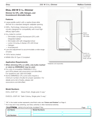 Lutron Dimmers at Build.com 6 Finishes. Lutron Ariadni 250 Watt 120 Volt Single Pole / 3-Way LED and CFL Dimmer. Model: AYCL-253P. $43.57. (1) 3 Finishes. Lutron Diva 600 Watt 120 Volt Single Pole Incandescent/Halogen Preset Dimmer with Locator Light and wall plate. Model: DVW-600PH. Starting at $28.57. Lutron Dvcl 153p Wiring Diagram - schematron.org 11.10.2018 11.10.2018 3 Comments on Lutron Dvcl 153p Wiring Diagram Check out our Wiring Wizard for step-by-step instructions, videos, and wiring diagrams (including 3-way) for installing a dimmer. Using a 3-way dimmer in a single pole application is accomplished by capping off one of the dimmer wires with a wire connector. Lumea C.L Dimmer Spec Submittal Part #3691001a - Lutron LECL-153P-XX 1. Single-pole / 3-way 2 ... Example: LECL-153PH-WH ... prior to wiring (see diagram). Removal of dimmer side sections may reduce maximum ...